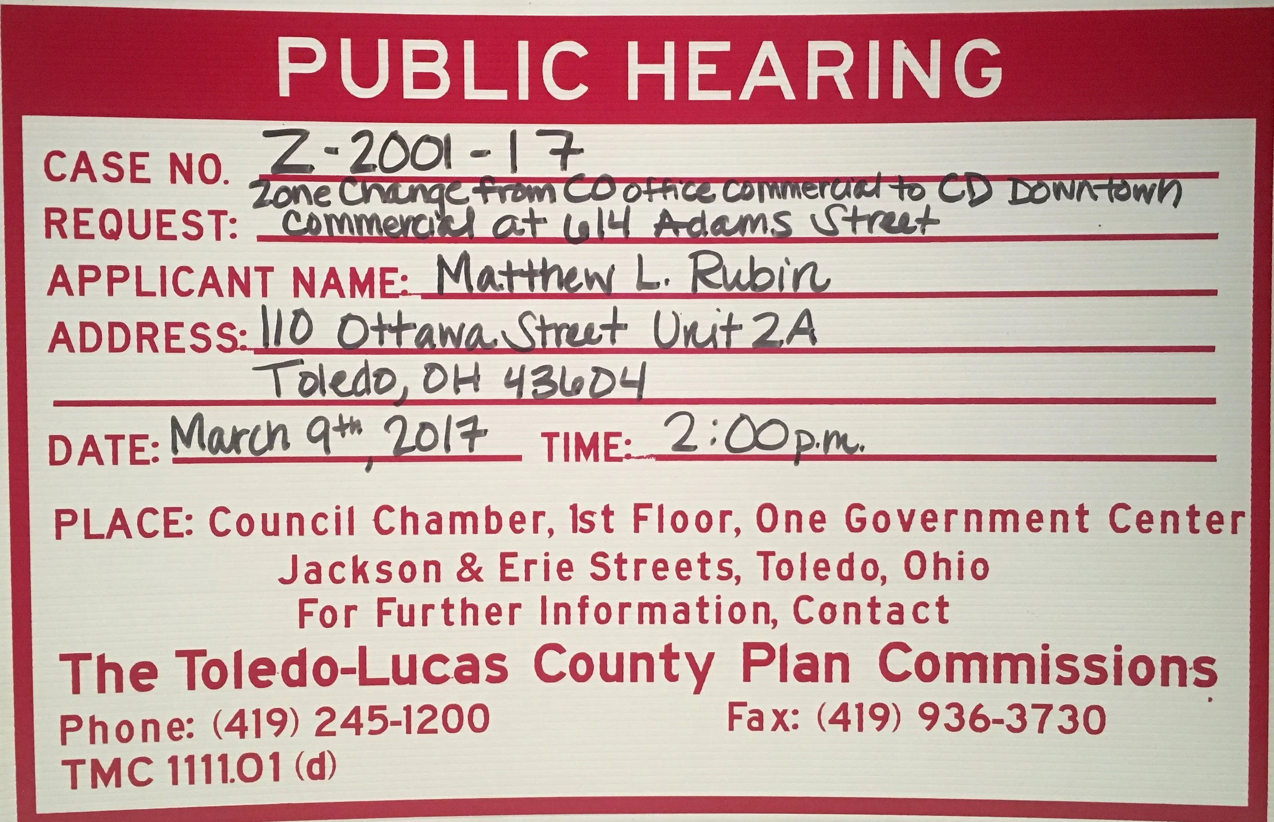 1. An application is first submitted to the Toledo Planning Commission along. You'll need to submit the physical application as well as the legal parcel description saved as a Word document on a flash drive to the Planning Commission. Head to One Government Center in downtown Toledo and sign in with your government issued ID. Take the elevator up to the 16th floor, suite 1620. Bring the completed application, flash drive and a check to pay the $300 application fee. It is worth pointing out that on-street metered parking is free on weekdays between 11 a.m. and 2 p.m.